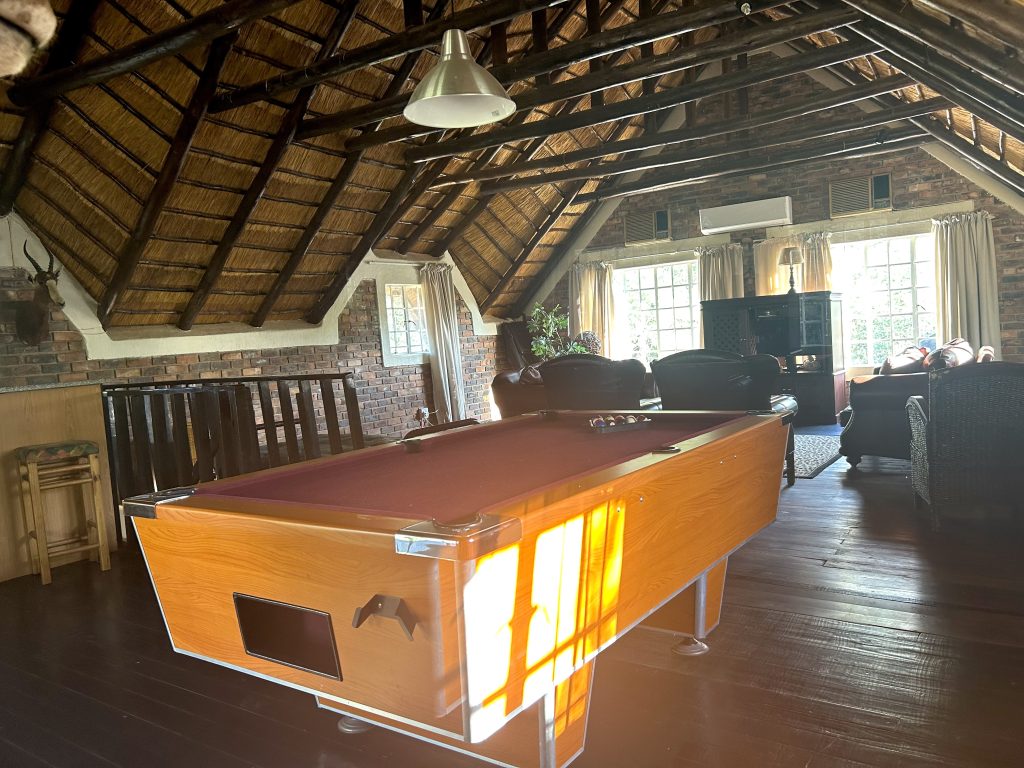 Inside the home you’ll find a fully equipped kitchen, comfortable lounge area, and two bathrooms. Upstairs includes a pool table, bar area, leather lounge suite, and TV with entertainment channels, creating the perfect space to unwind after a day exploring Marloth Park or Kruger National Park.