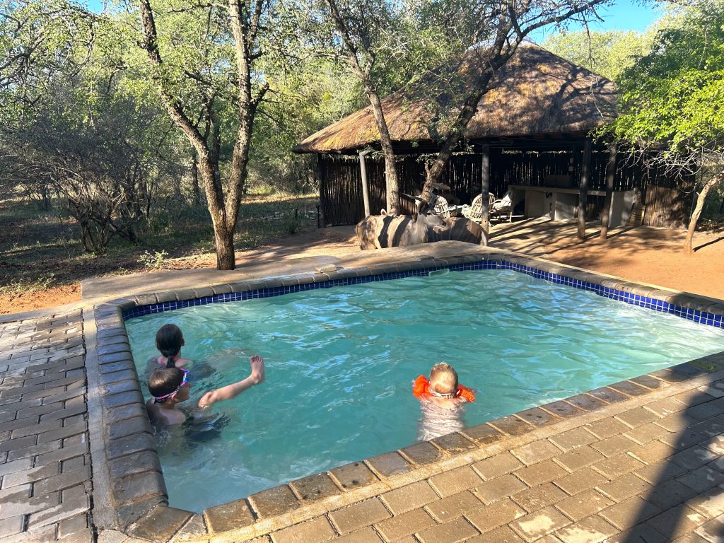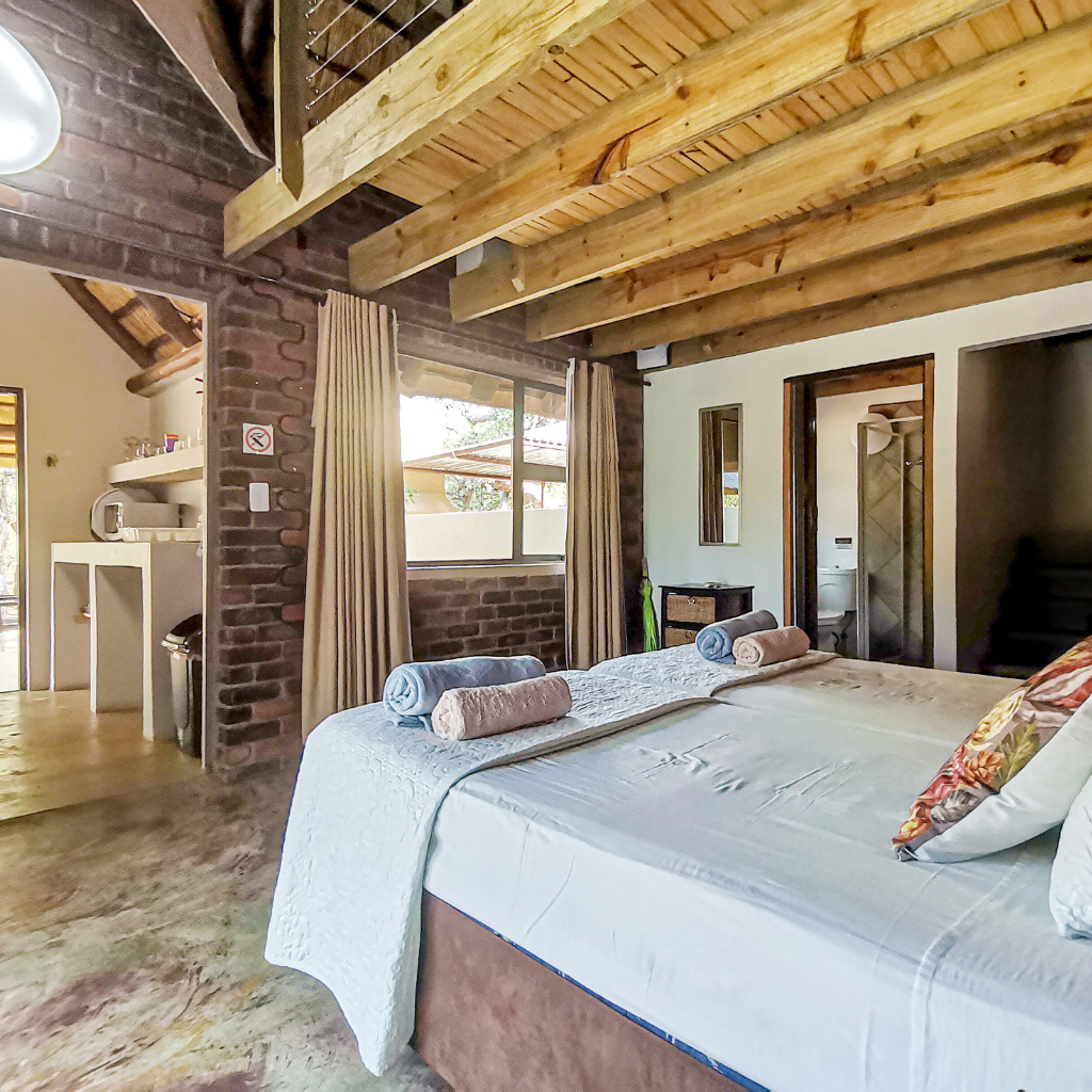 Guests can enjoy a variety of indoor and outdoor living spaces designed for relaxation and entertainment. Downstairs features a sparkling swimming pool, boma, and patio area, while the upstairs patio offers beautiful bushveld views where wildlife sightings are common.